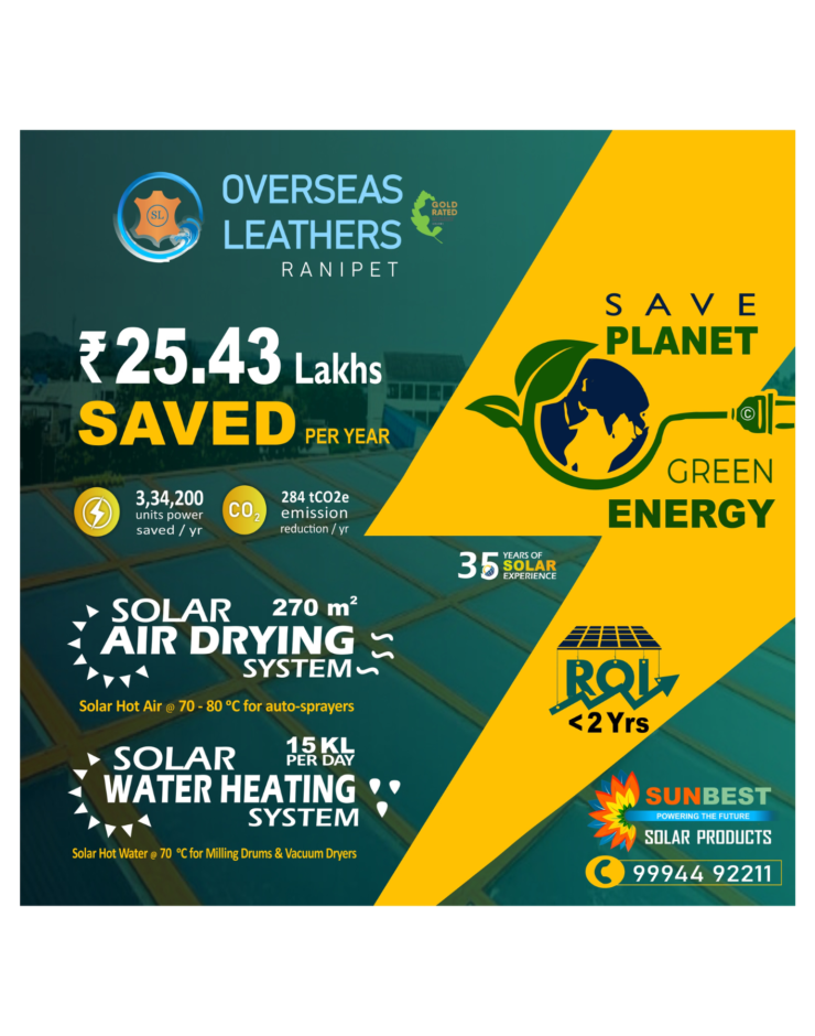 M/s. Overseas Leather, Ranipet The solar hot air solution of M/S SUNBEST to auto sprayer in Calico leather factory, Kanpur sponsored by UNIDO has demonstrated the concept of clean technology to leather industry.