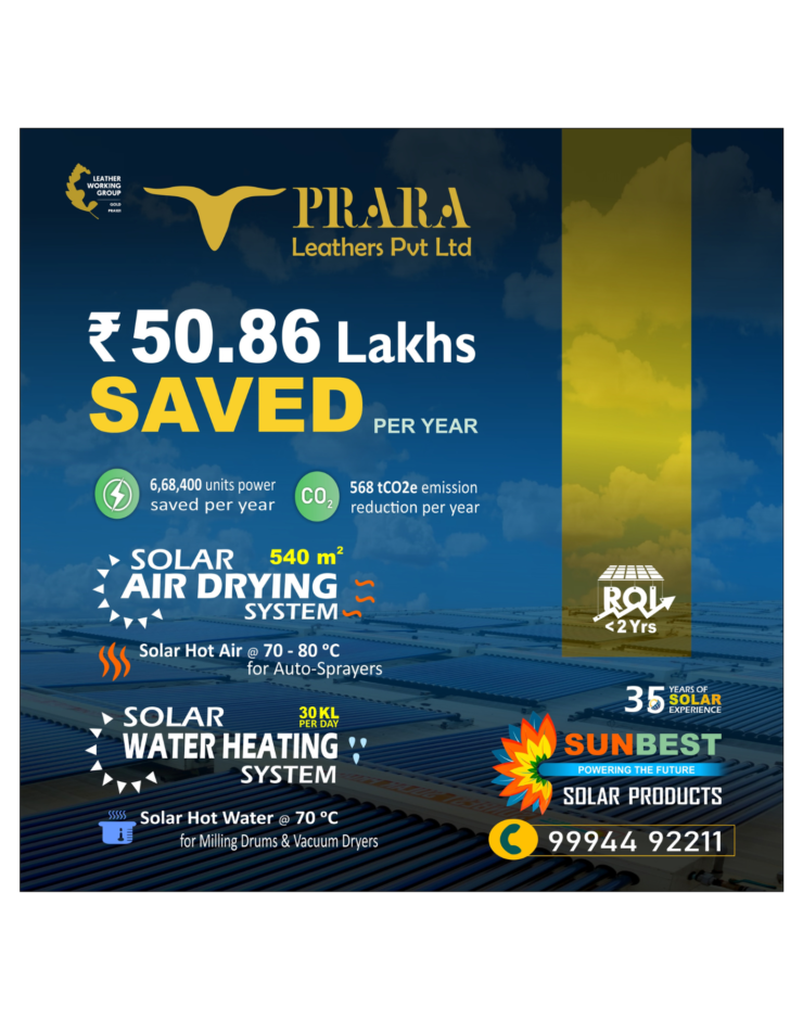 In 2018, we installed a 50,000L/day solar water heating system at Avanti Leathers and subsequently we have installed a 540 sq.m solar air drying system and a 30,000L/day solar water heating system at Prara Leathers, Ranipet. These systems led to substantial electricity and steam savings, cutting overall energy costs. We are proud to stat that since September 2023, our Ranipet unit operates solely on Sunbest's solar solutions without the need for our 4-tonne and 2-tonne firewood boilers. This transition to green energy not only enhances our corporate image but also contributes to a sustainable future. We appreciate the Sunbest team for their dedicated support.