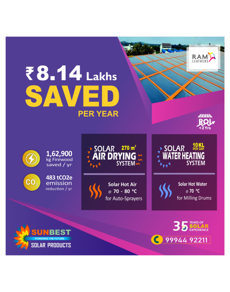 Prara Leathers Pvt. Ltd, RanipetSunBest Solar's air and water heating systems at our factory since 2023 has significantly cut energy costs, delivering efficient hot air and water for our processes. We are so convinced with the system's reliability as well as by the prompt after sales service to minor issues, that we are on the process of installing our 3 Solar Project - a 315sq.m Solar Air Dryer at present. I highly recommend SunBest's eco-friendly solutions, having already done to our industrial partners.